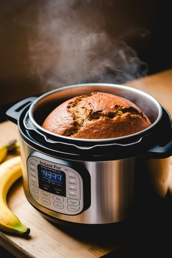 For even cooking, use a 6-cup bundt-style pan. First, cream butter and sugars, then add eggs, vanilla, mashed bananas, and sour cream or buttermilk. Next, sift dry ingredients like flour, baking soda, baking powder, cinnamon, and salt. Gently fold these into the wet mixture. Pour the batter into the pan, cover with foil, and place on a trivet with 1½ cups of water. Pressure cook on high for 50 minutes, then let it rest for 15 minutes.