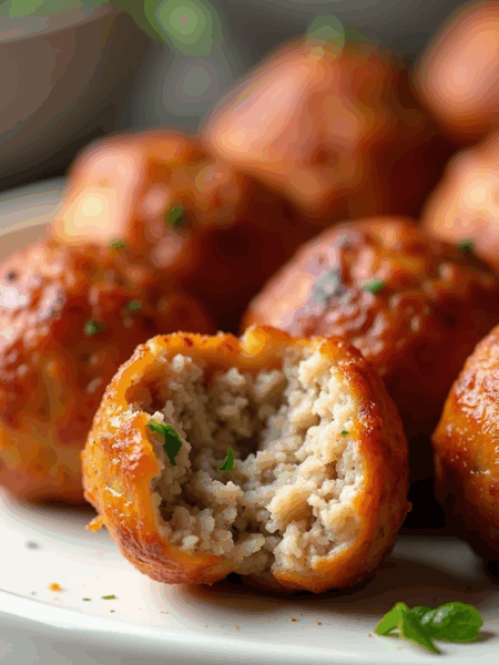 A beautifully arranged platter featuring golden-brown Ground Beef Parmesan Meatballs, garnished with fresh parsley and a sprinkle of grated Parmesan cheese. The meatballs should be glistening with a rich, savory tomato sauce, highlighting their texture and flavor. In the foreground, a wooden cutting board holds a small bowl of herbs and spices, while a fork gently rests beside the platter. In the middle ground, a rustic kitchen setting with warm, soft lighting creates an inviting atmosphere, showcasing wooden shelves filled with cooking ingredients. The background includes blurred kitchen utensils and fresh vegetables, adding depth without distraction. The overall mood is cozy and appetizing, evoking a sense of home-cooked comfort food. Shot with a shallow depth of field to focus on the meatballs, enhancing their delicious appeal.