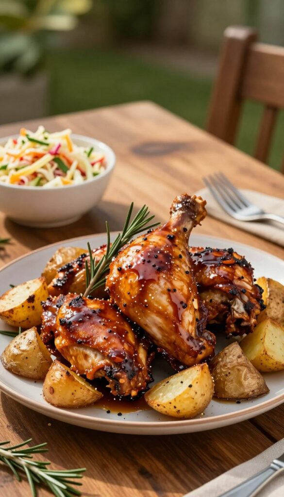 A simple yet flavorful dish where chicken thighs and potatoes are seasoned, doused in BBQ sauce, then baked together for a hearty meal.