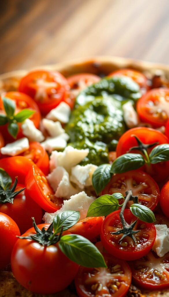 Imagine the harmony of flavors when vibrant, fresh pesto meets the tangy sweetness of ripe tomatoes, all crowned by the creamy, melt-in-your-mouth delight of fresh mozzarella. This pizza is a symphony of textures and flavors that dance together on a crispy, golden crust, a true celebration of simple yet powerful ingredients.