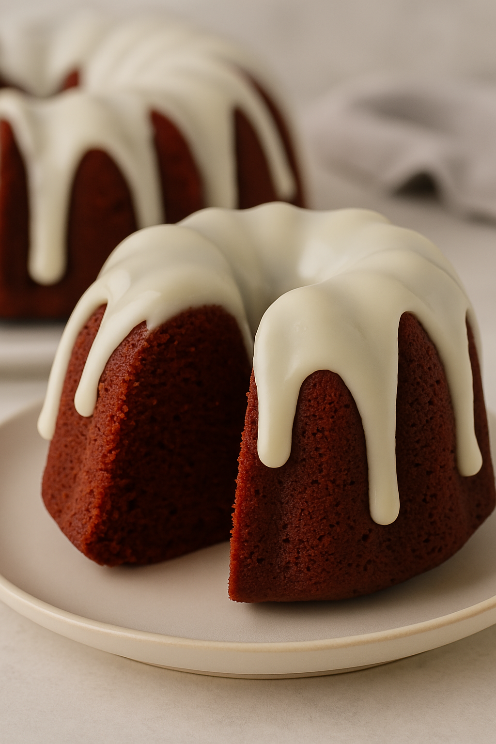 Indulge in the rich, velvety texture and vibrant red hue of this Red Velvet Bundt Cake, topped with a luscious cream cheese glaze.