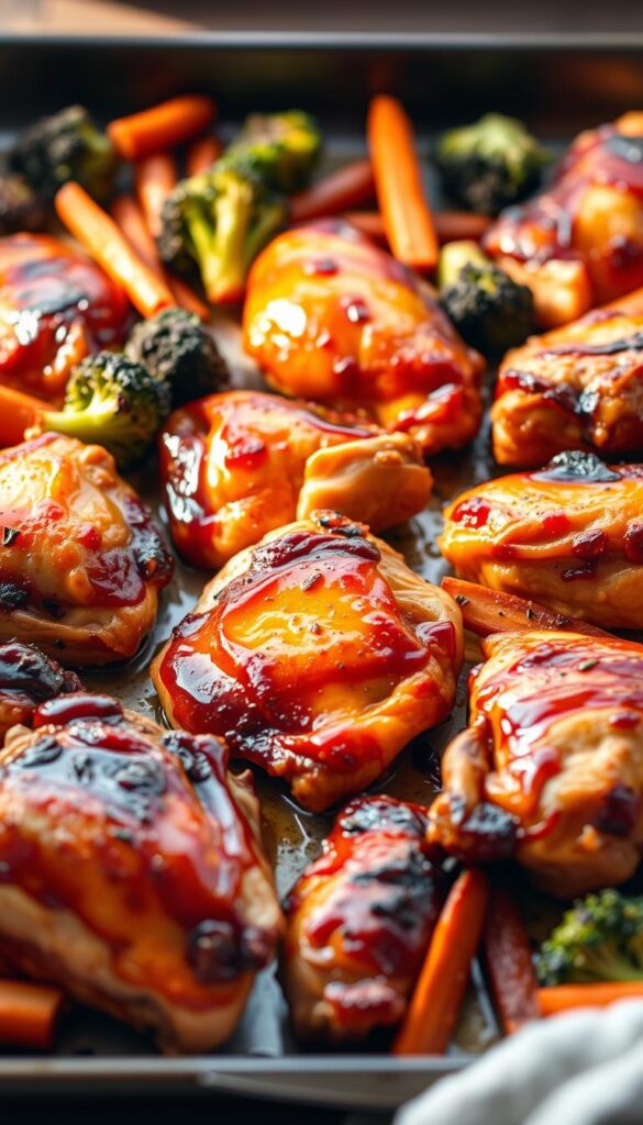 A sheet pan filled with juicy, caramelized teriyaki-glazed chicken thighs, arranged in a visually appealing layout. The thighs have a succulent, bronzed skin and are accompanied by vibrant, roasted vegetables like broccoli and carrots. The scene is bathed in warm, natural lighting, creating a cozy, appetizing atmosphere. The camera angle is slightly elevated, showcasing the delectable details of the dish. The overall mood is one of effortless, mouthwatering home-cooked goodness.