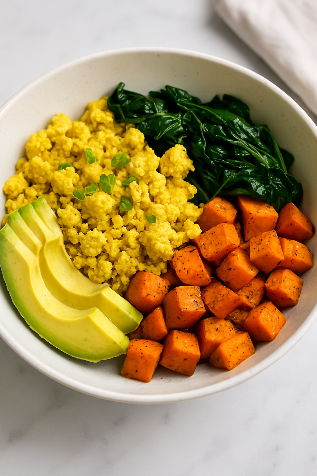 Spoon the tofu scramble into bowls. Garnish with fresh herbs or avocado slices if desired. Serve hot and enjoy your delicious, wholesome breakfast bowl.