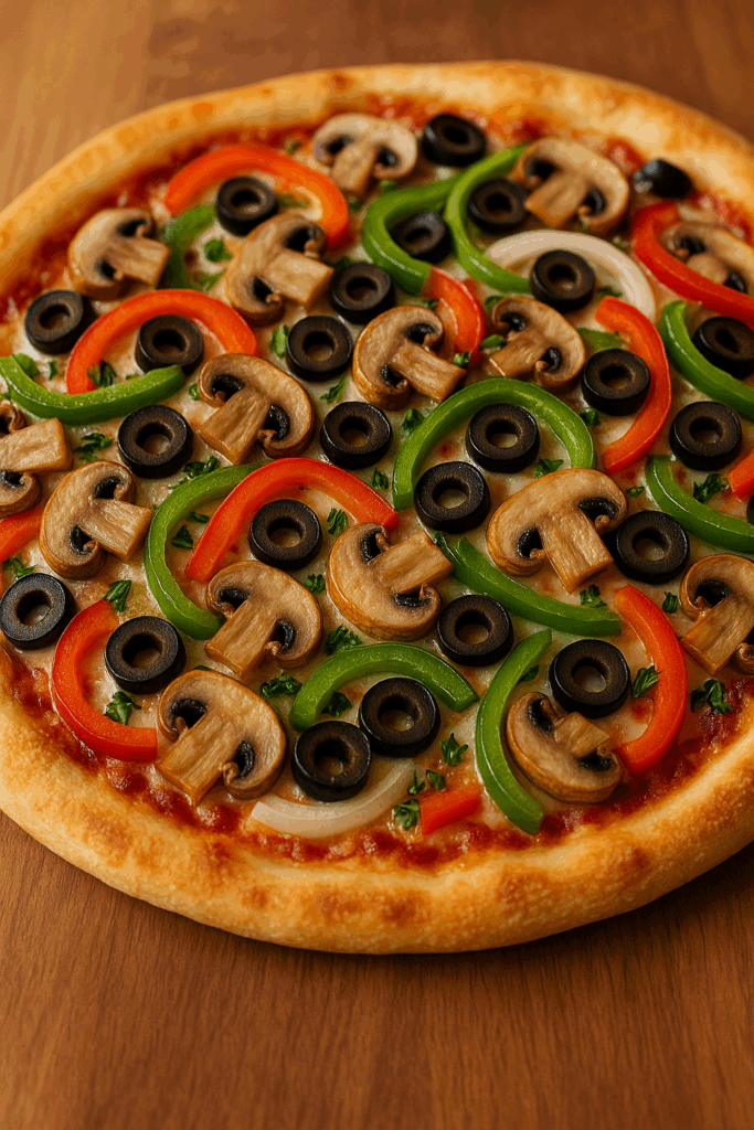 A delightful veggie pizza loaded with mushrooms, olives, bell peppers, and onions, perfect for a family dinner or a casual get-together.