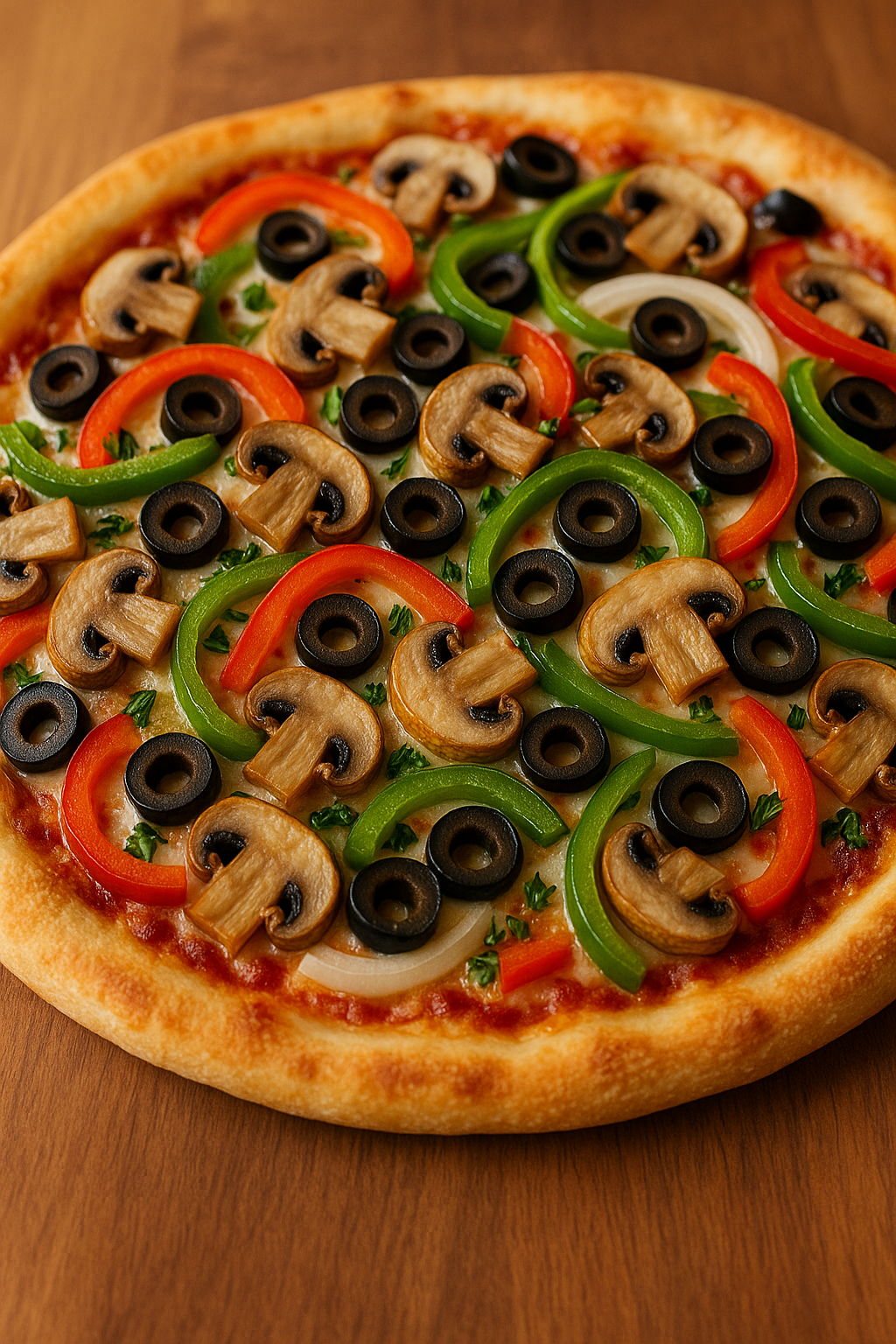 A colorful medley of mushrooms, olives, bell peppers, and onions atop a crispy crust, bringing a vibrant taste of garden-fresh goodness to your table.